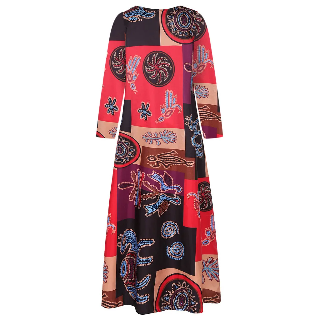 REJEA Women Vintage Elegant Party Dress Plus Size Print Daily Long Sleeve Vintage Bohemian Dress V Neck Maxi Dres Long Dress